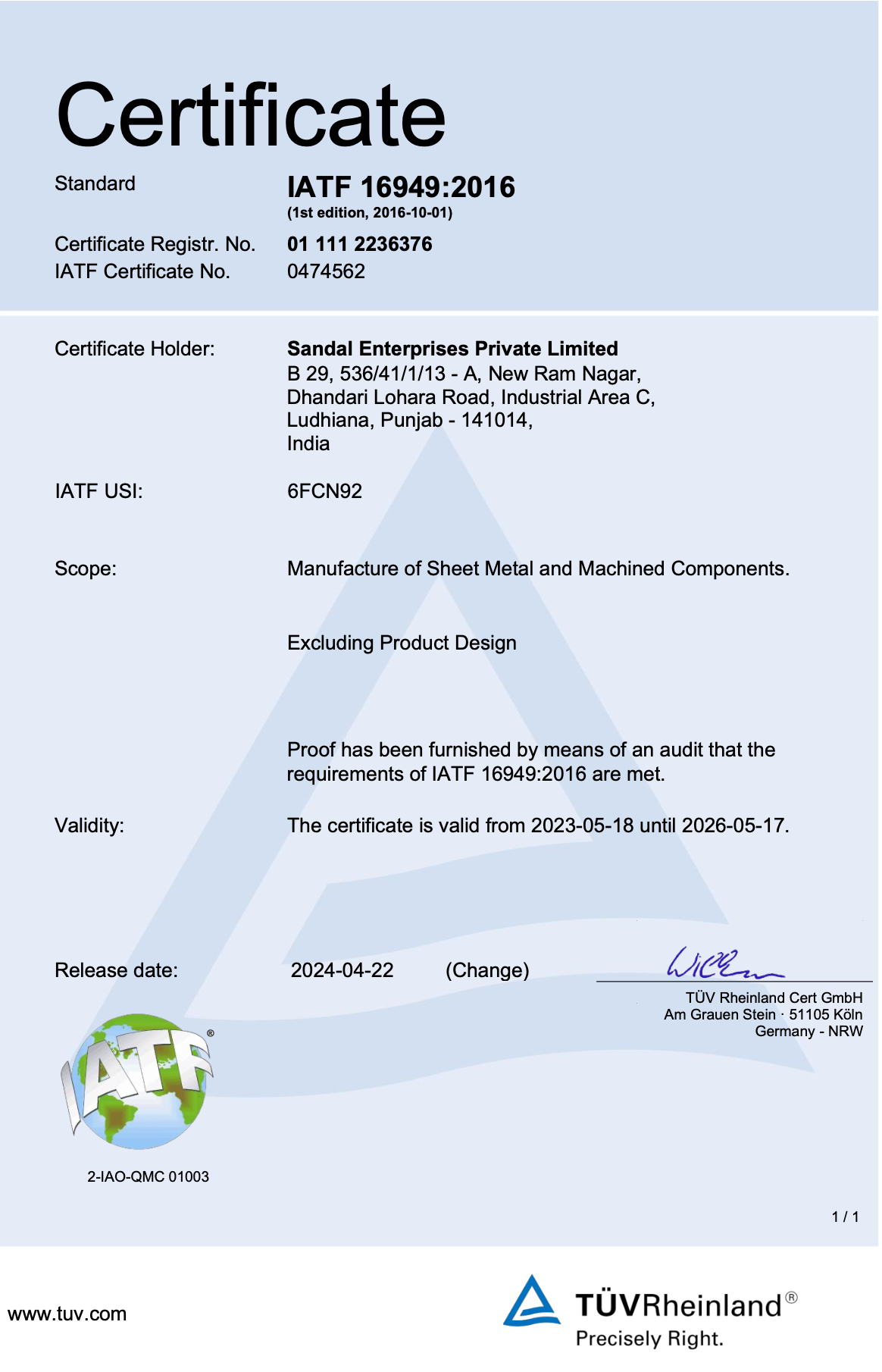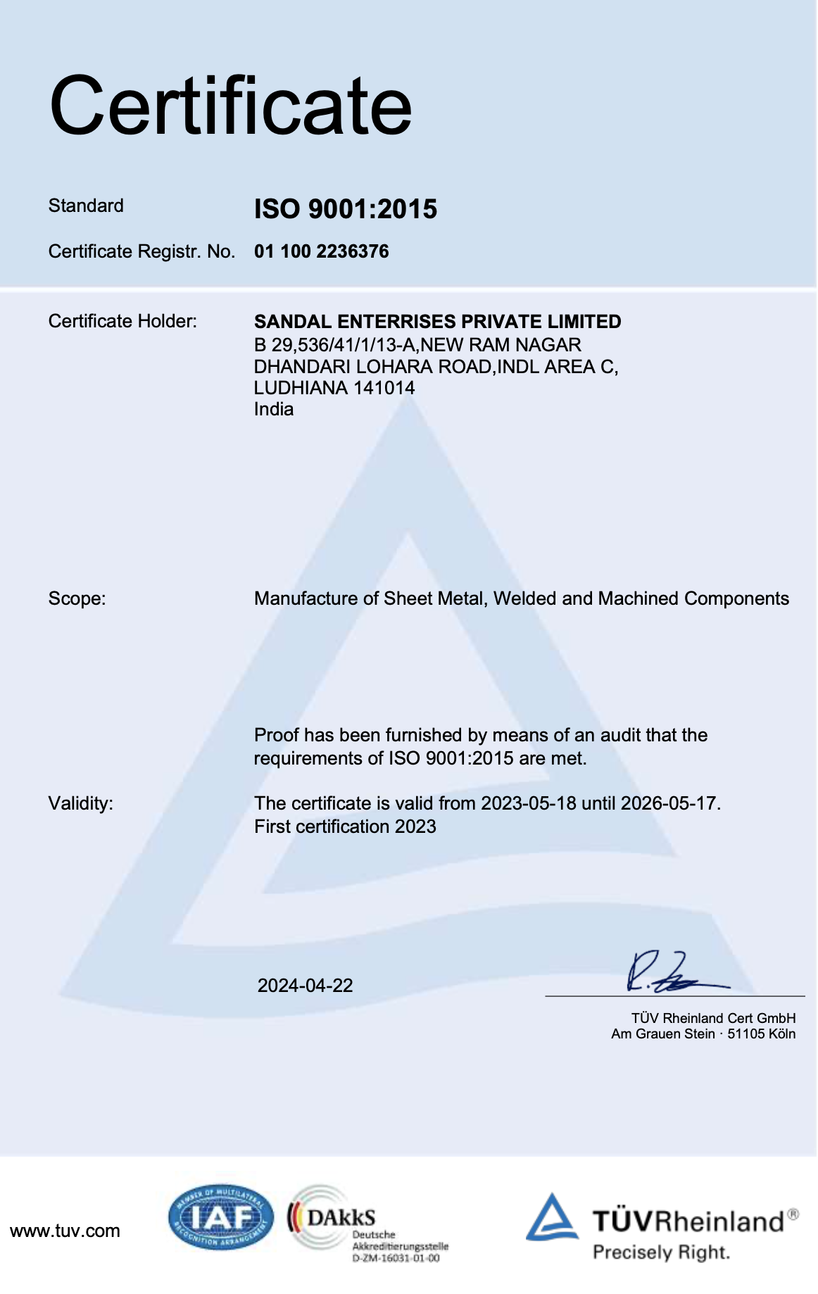 Established in 2009 and backed by over 30 years of industry experience, Sandal Enterprises, based in Ludhiana, Punjab, is a trusted name in the manufacturing and supply of precision sheet metal components. Led by Mr. Sukhminder Singh and Mr. Gurvinder Singh , the company is certified with ISO 9001:2015 and IATF 16949:2016, reflecting our unwavering commitment to quality and continuous improvement.